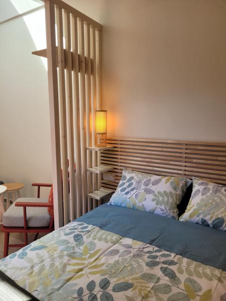 Accessible par sa terrasse privative au calme qui donne de plein pied sur le studio. Un espace de couchage cocoon avec TV WiFi et Internet ainsi que des prises de charge.Espace de repos central pour lire ou travailler.